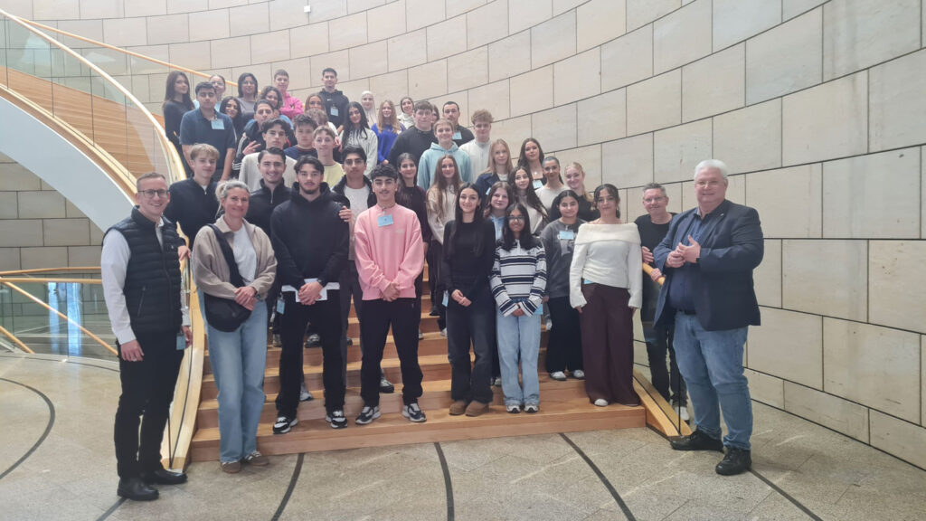 Einen besonderen Ausflug machten Schülerinnen und Schüler der Gesamtschule Duisburg Meiderich: die Jahrgangsstufe EF besuchte den Düsseldorfer Landtag. Im hochmodernen multimedialen Landtagsforum wurde die Arbeitsweise des Parlaments vorgestellt. In der anschließenden Fragerunde mit dem Abgeordneten Frank Börner wurde ein bunter Blumenstrauß an Themen angesprochen und diskutiert. Es ging um Allgemeines wie z. B. Verwendung von KI, Umgang mit Social-Media-Plattformen aber auch um Lokales wie Nachhaltigkeit in Duisburg oder der Ausbau der A59.